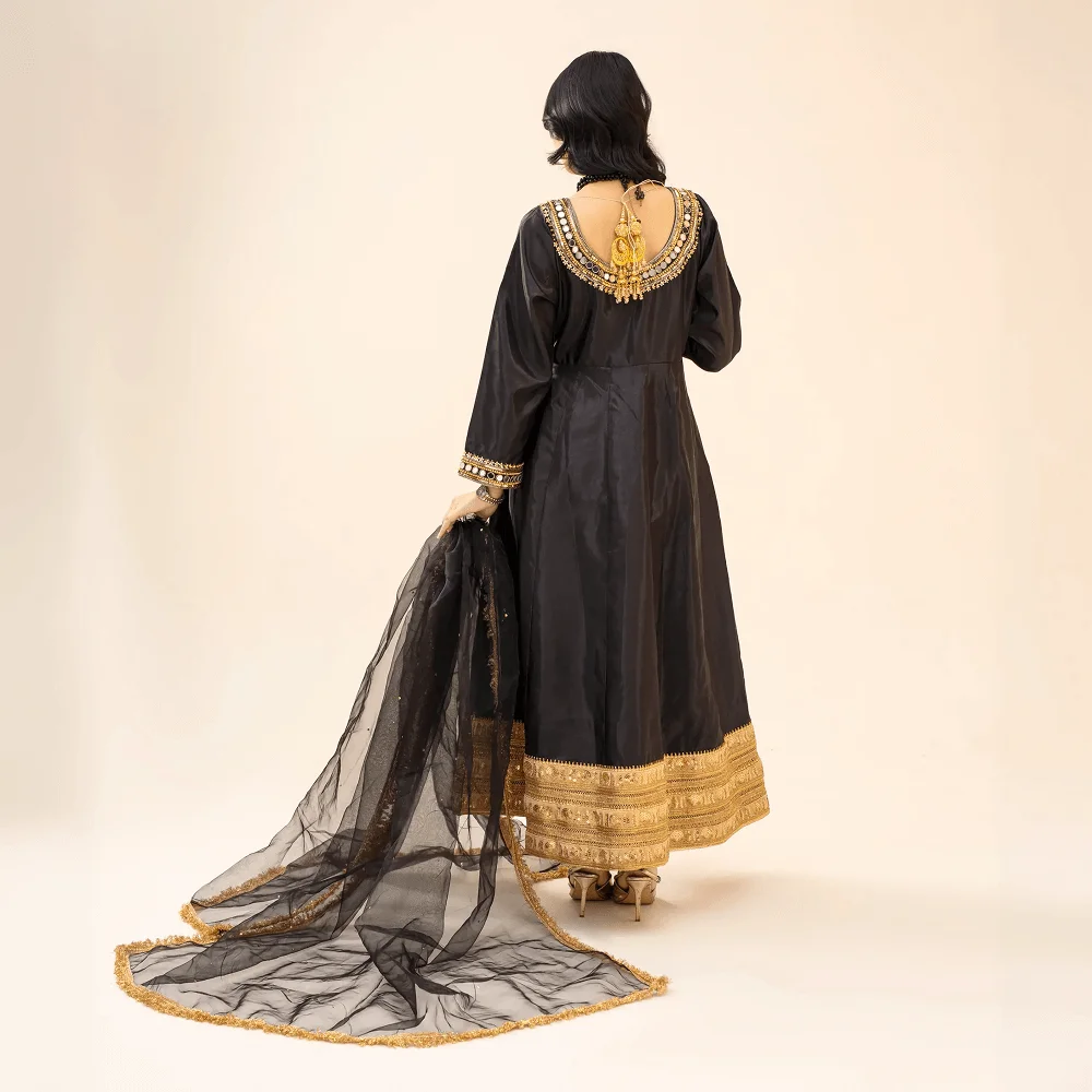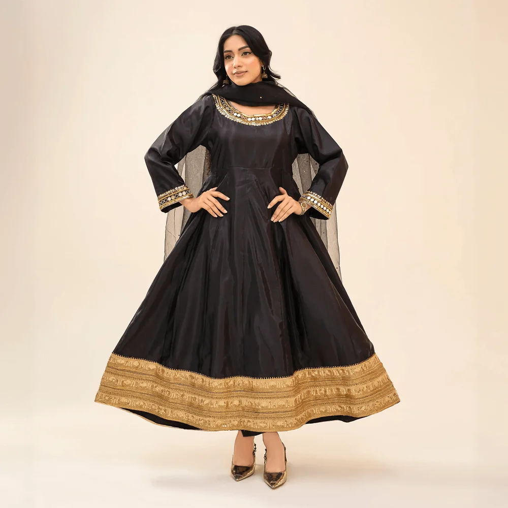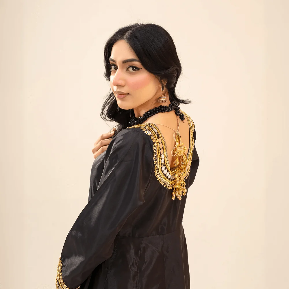 • Hand-embellished round neckline with intricate cord dabka work