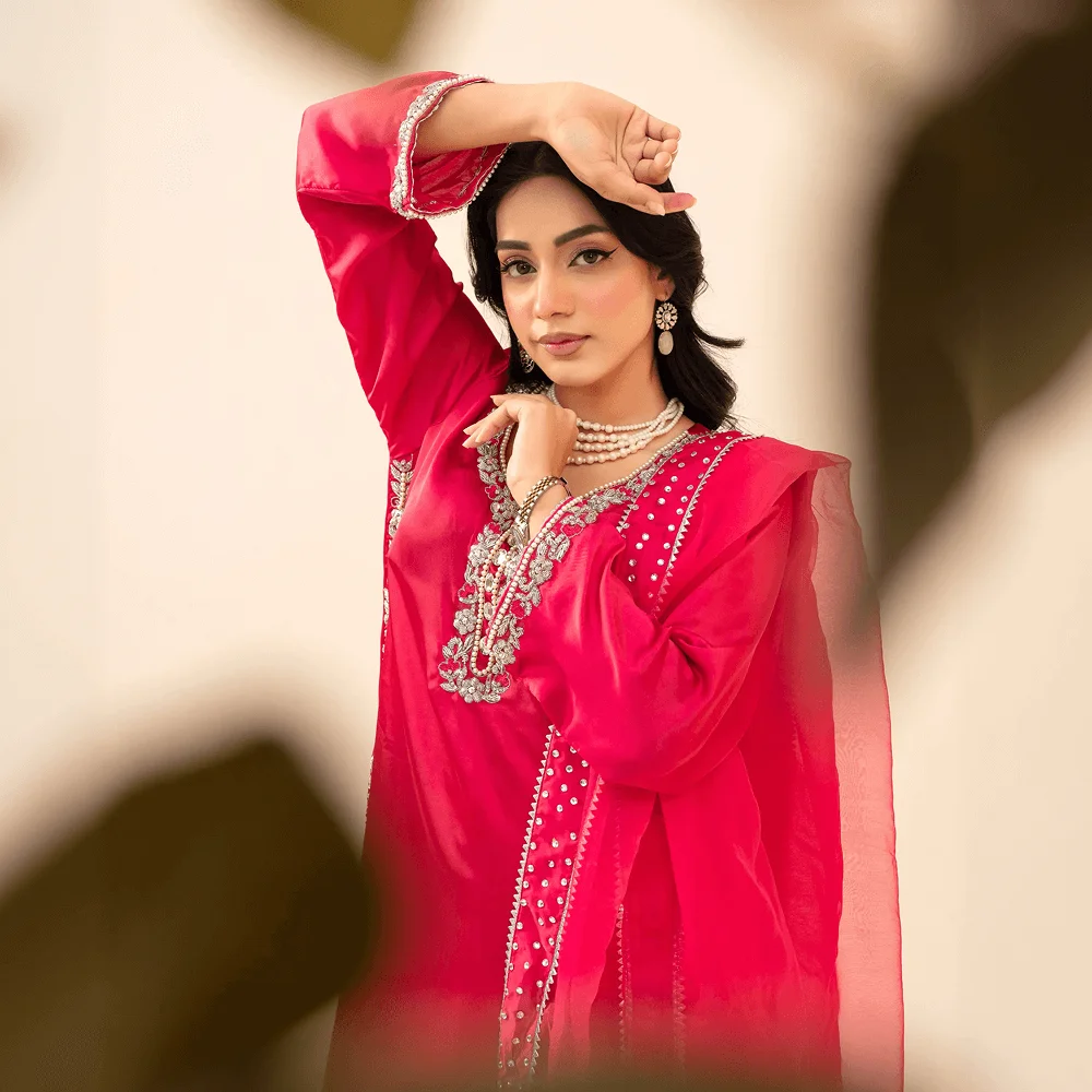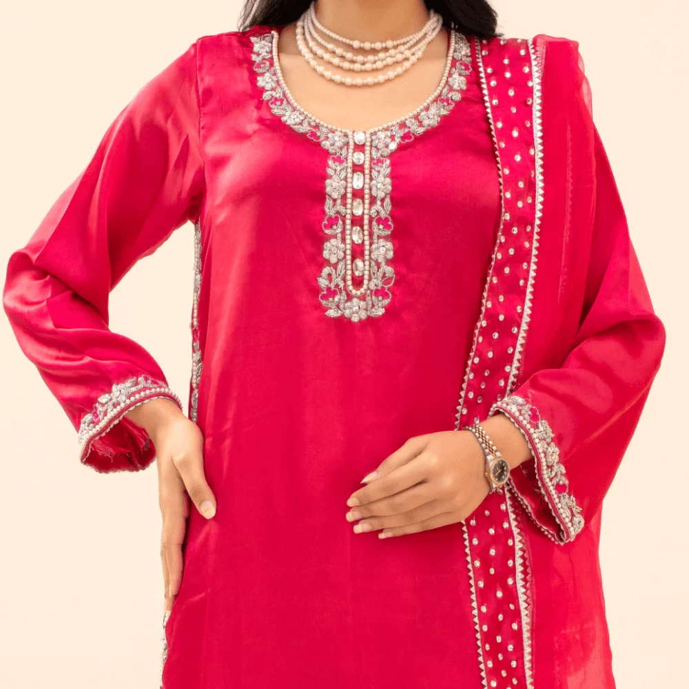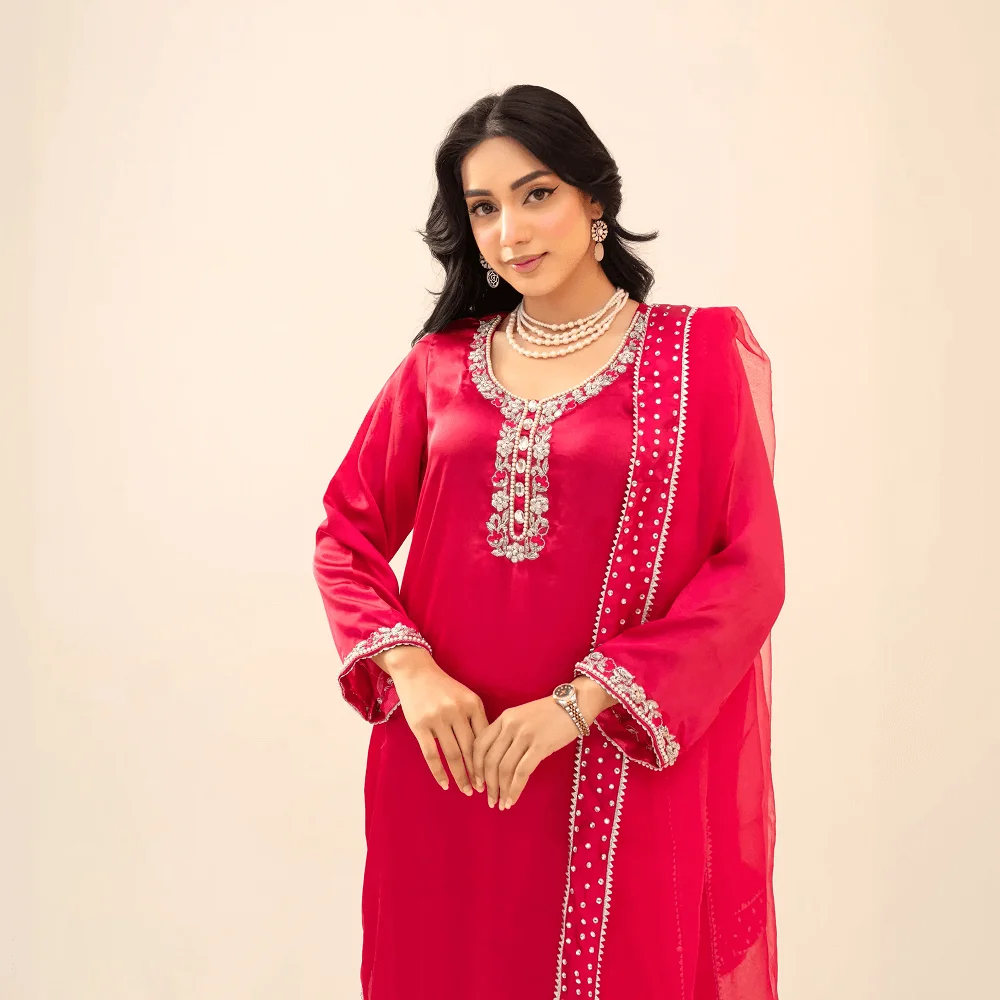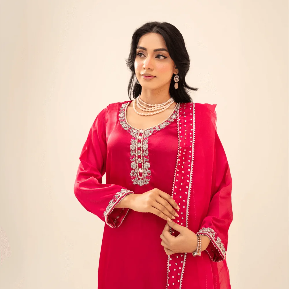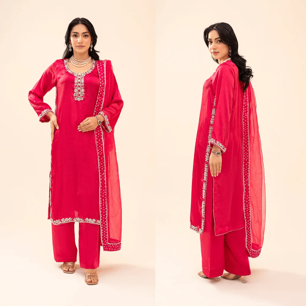A graceful long shirt paired with a stylish palazzo, designed for a rich festive look. The shirt is beautifully adorned with heavy cord dabka work on the neckline, sleeves, and borders, showcasing fine traditional craftsmanship and elegant detailing.